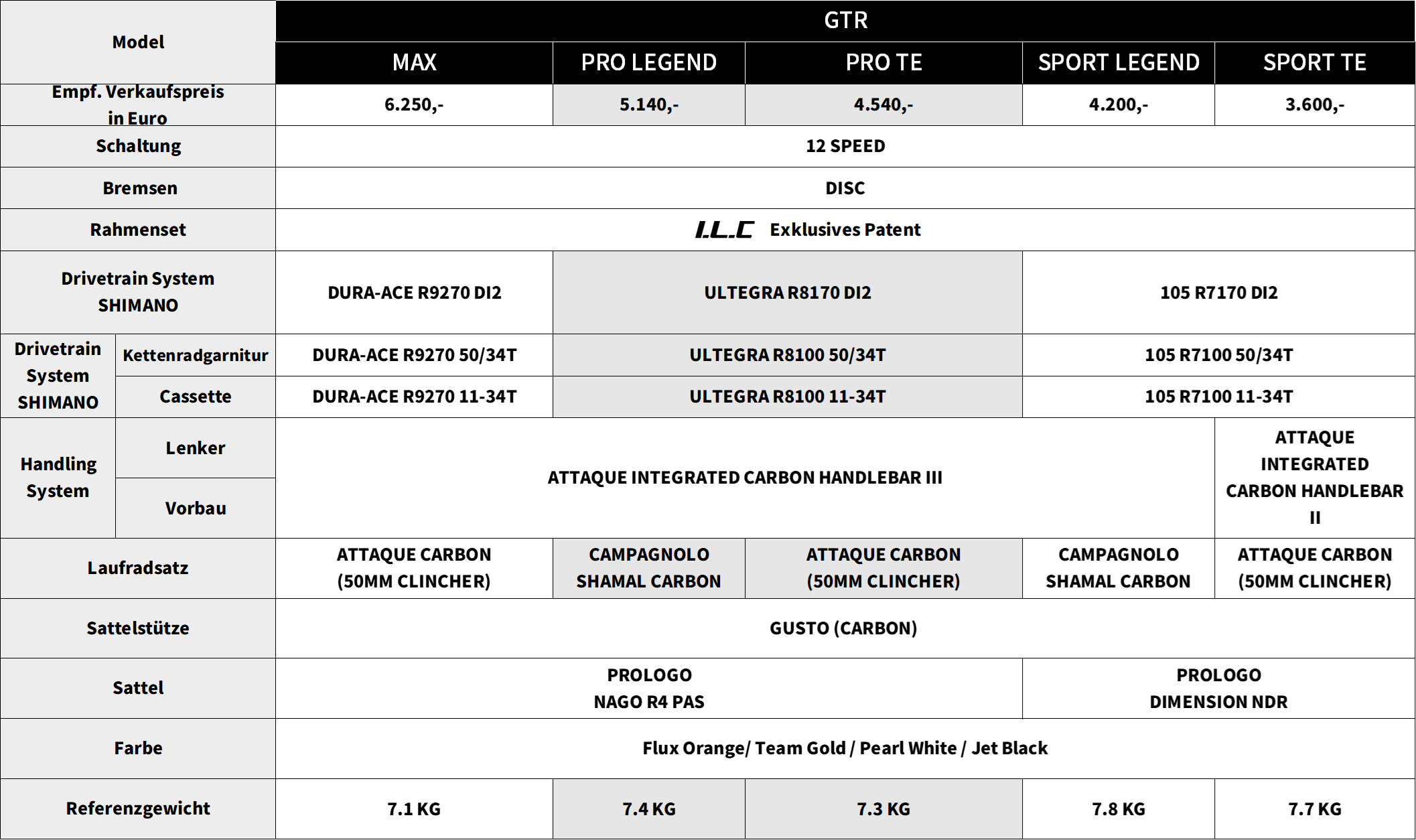 Das neue GTR-Rahmendesign zeichnet sich durch einen höheren Stack und eine kürzere Reach-Geometrie aus. Dadurch bietet es Fahrern – egal ob beim Bergauffahren oder auf langen Strecken – eine aerodynamische Sitzposition und reduziert die Belastung beim Radfahren, ohne die Agilität für Sprints zu beeinträchtigen. Der nach hinten verlagerte Schwerpunkt verringert die Ermüdung beim Lenken, erhöht die Stabilität bergab, verhindert Untersteuern in Kurven und verbessert das Handling bei Langstreckenrennen. Zusätzlich ist die Konstruktion der hinteren Kettenstreben auf Sprintsteifigkeit und Traktion beim Bergauffahren optimiert.Japan T1000 High Performance Carbon Fiber.