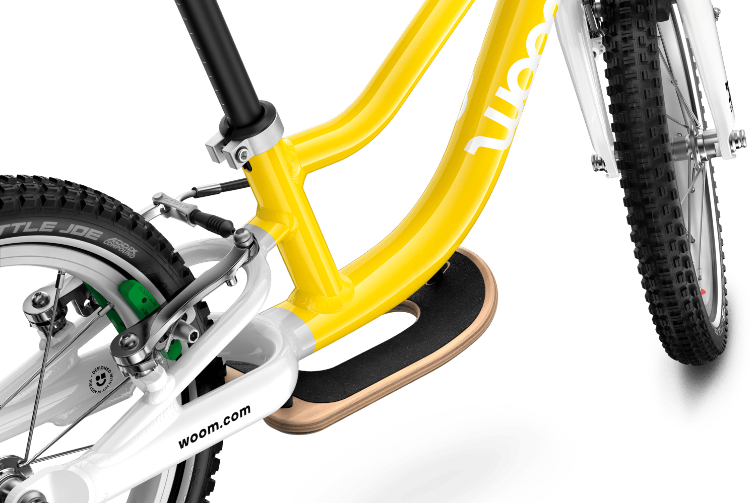 • Durchdachte Laufräder: Das woom GO 1 ist mit hochwertigen Laufrädern ausgestattet, bei denen jedes Detail gut durchdacht ist – von den geschmeidig laufenden Naben über die robusten Speichen aus Edelstahl bis hin zu den leichten Alu-Felgen. Die extra schmale Nabe am Hinterrad bietet deinem Kind zudem besonders viel Beinfreiheit beim Laufen.